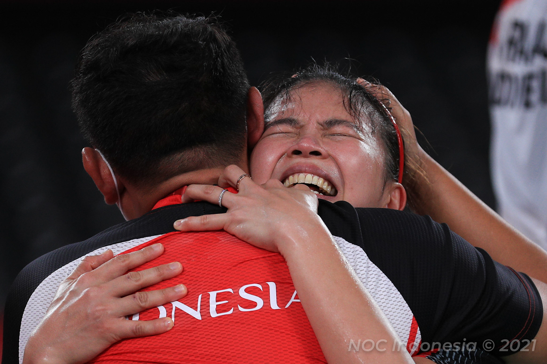 Senin, 2 Agustus 2021. NOC - TO2020 - PHO - Day 13 - Badminton, Women's Doubles Final, Greysia Polii-Apriyani Rahayu vs Chen Qing Chen-Jia Yi Fan (CHN) di Musashino Forest Sport Plaza, Tokyo - Jepang